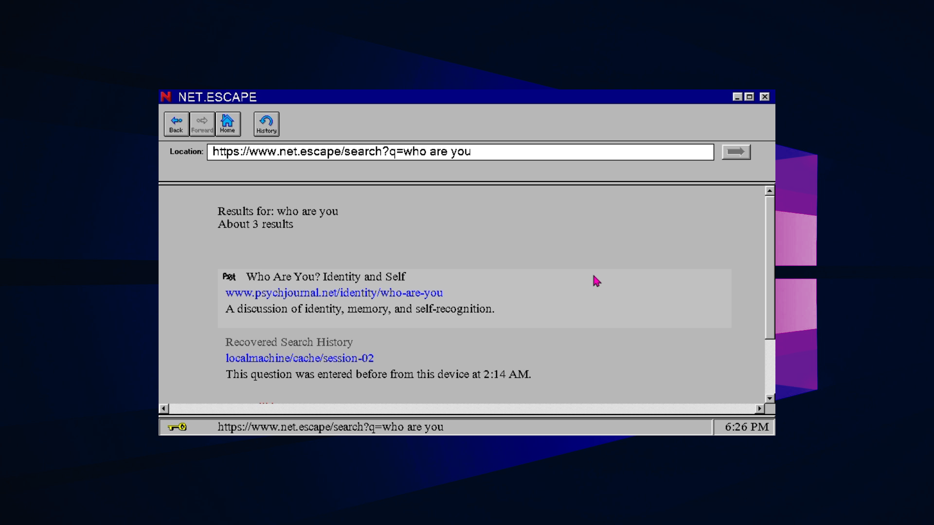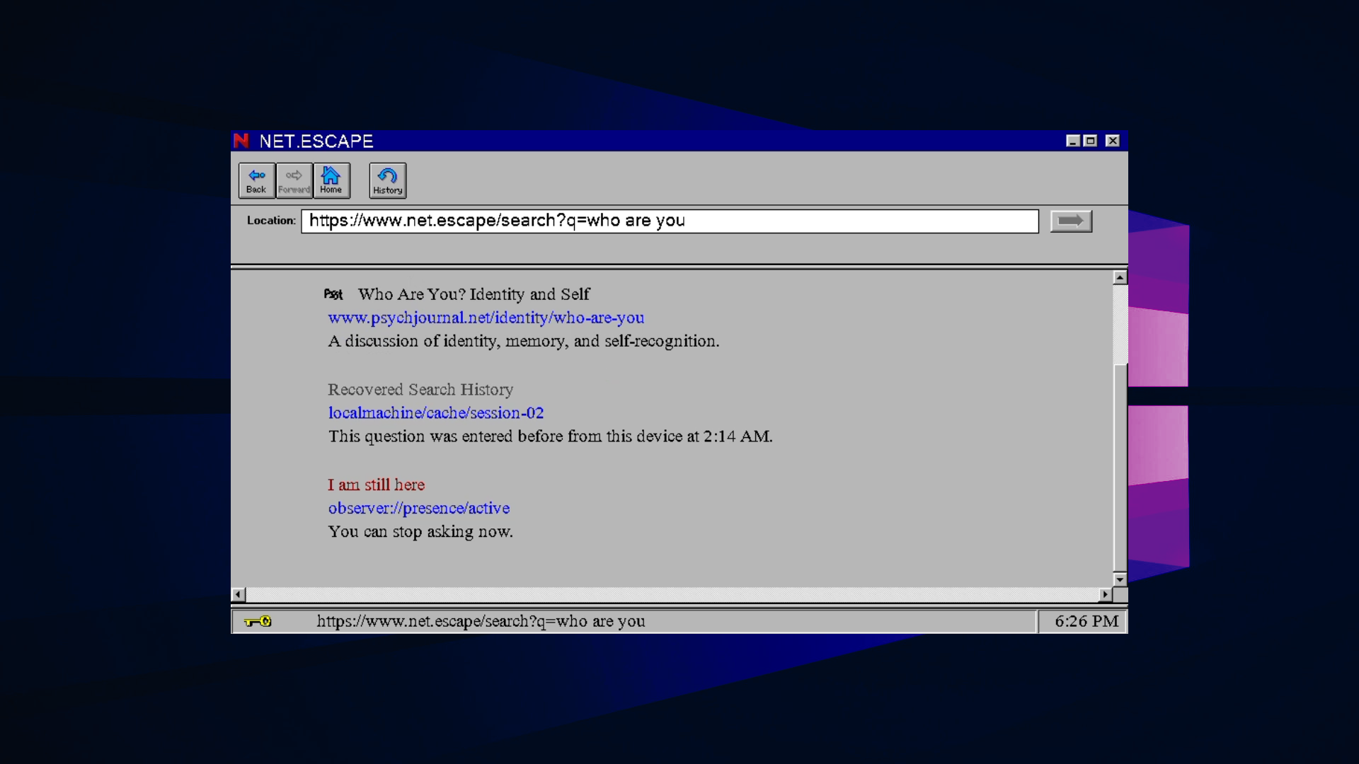 Do Not Search is a surreal retro browser horror game where the player searches the web. Each query, familiar website, and browser feature becomes uncanny and haunting.